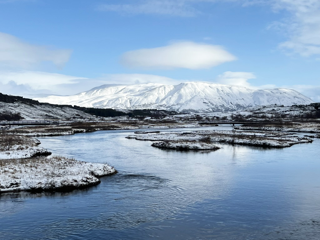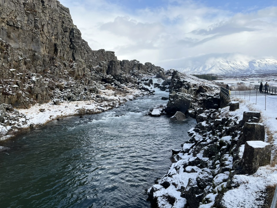 The glorious Thingavellir National Park is situated on the border of two tectonic plates, which makes for a unique landscape. I enjoyed my visit enormously. The snow cascaded down and wreaked havoc as I climbed the steps to meander up, down, around, and through the jagged gorges. Whilst there I managed to block in a camper van in the parking lot, it was totally accidental, and was not directly just my doing, but I certainly contributed. The snow had covered all the parking bay line spaces and it was a bit of a free-for-all, and the guy in the camper van got boxed in. I sheepishly drove away. quickly!