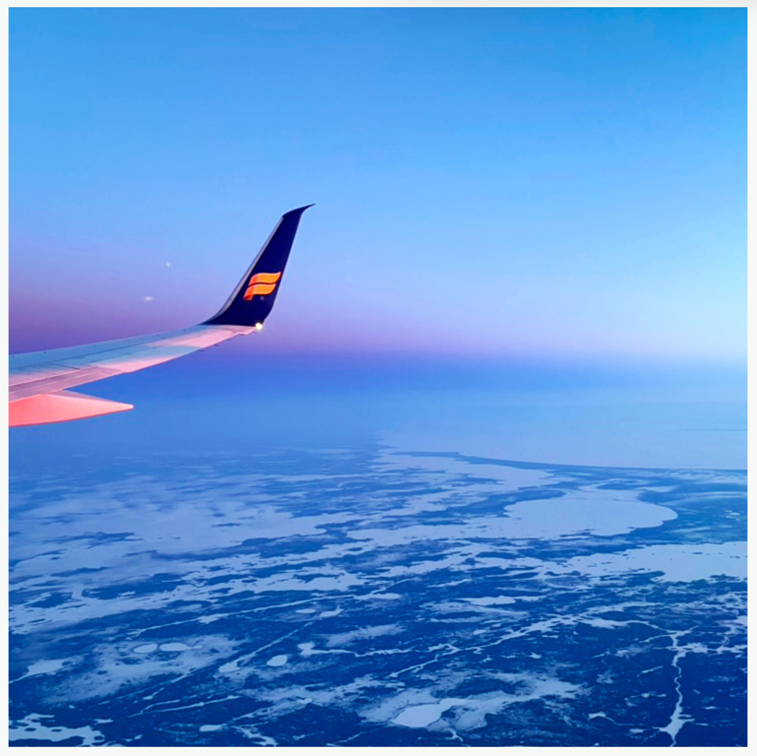 I wiled away time listening and laughing to a Rob Brydon podcast gazing out of the airplane window and watching the changing scenery. As the sun was going down it glistened the brightest red off the airplane wing, the sky was lilac, and the ground a patchwork of winter. As the sun went down I dreamed of seeing the northern lights.
